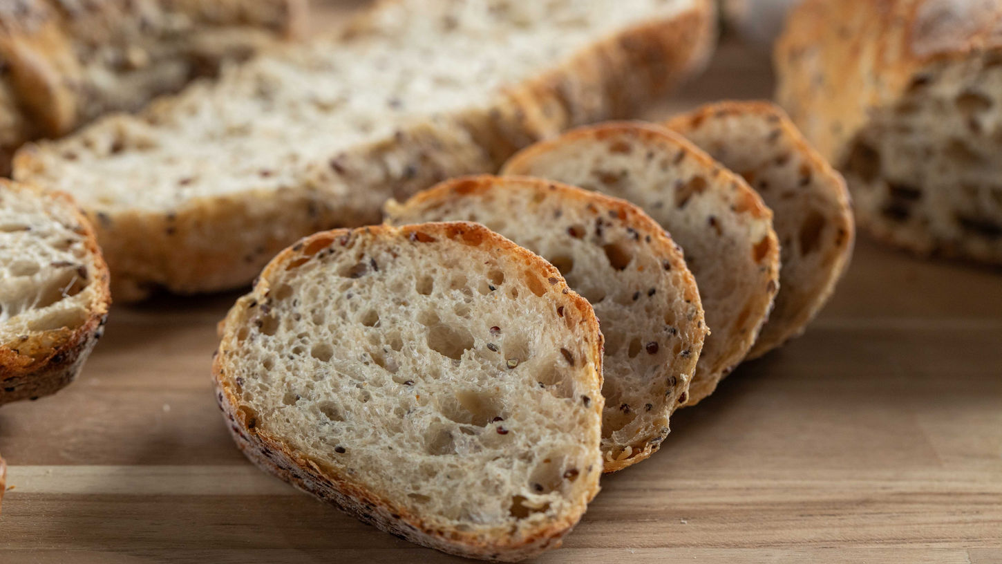 Massa mista de altíssima hidratação e longa fermentação natural com mistura de grãos selecionados e levemente tostados de linhaça marrom, girassol, chia, quinoa vermelha, abobora e kümmel. Textura leve e aerada. Perfil de sabor mais complexo de grãos. Um pão para quem gosta de grãos e cereais. Casca fina. Peso aproximado de 100g.